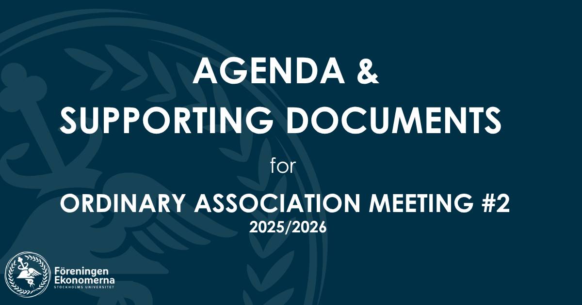 Hej! Bifogat finns föredragningslistan med bilagor på engelska till andra ordinarie föreningsmöte 2025/2026, söndag den 12:e april 2026, kl. 11:00–20:00. Mötet äger rum i Hörsal 1, Hus 1, plan 2,